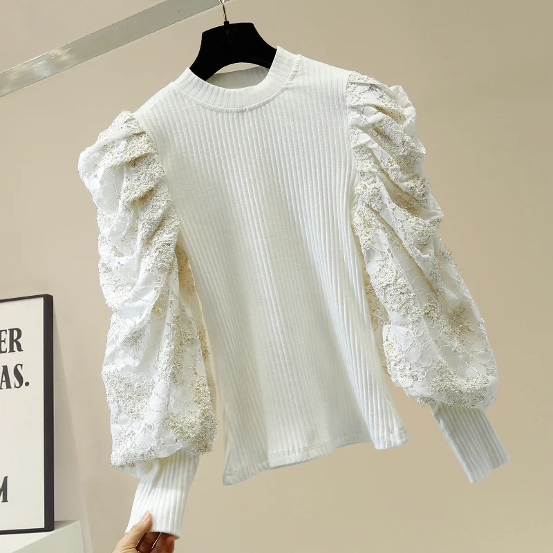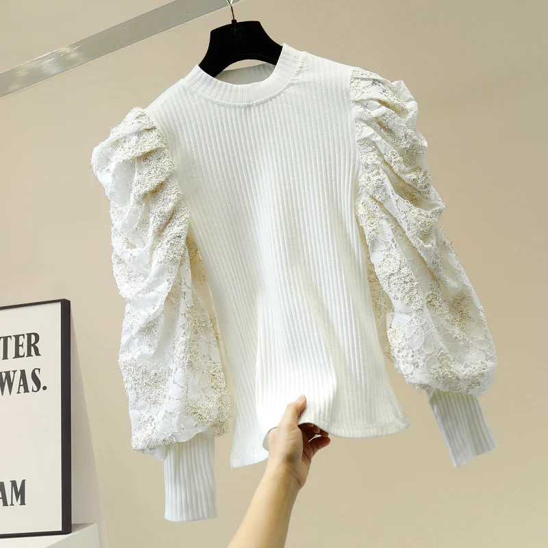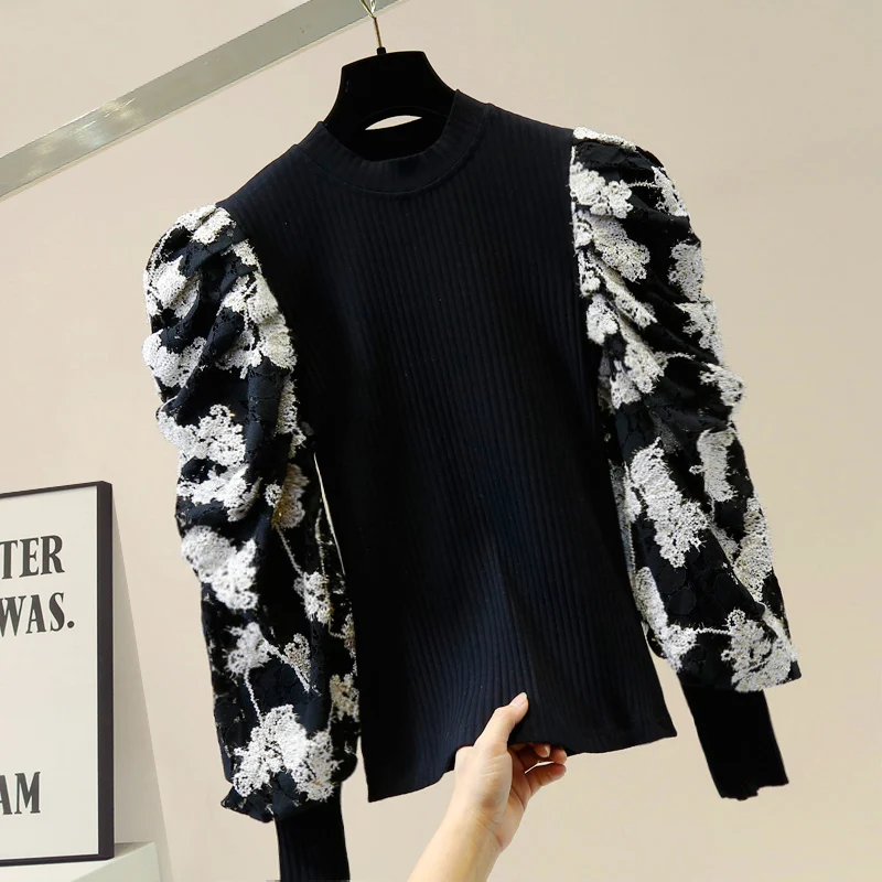 Special Offer for Retro Palace Style Lace Embroidered Puff Sleeve Stitching Sweater Women's Sweater Shirt Knitted Shi